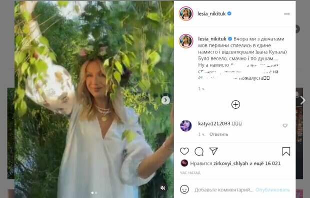 Телеведущая Леся Никитюк похвасталась образом в честь праздника Ивана Купала Ведущая пользуется большой популярностью в Украине, передает Politeka.net. В своем Инстаграм Никитюк часто предстает в интересных образах. В этот раз блондинка примерила длинную сорочку и венок в честь праздника Ивана Купала, который праздновался с 6 на 7 июля.