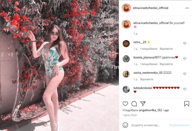 В этот раз звездная красотка показала фанатам яркое и жаркое фото с отдыха, на котором появилась в смелом образе. Как видно, на новом снимке Элина запечатлена в интересной локации, она стоит у цветущего куста и изящно позирует фотографу, выгнув спину и выставив ножку. Перед камерой она появилась в стильном пестром купальнике закрытого фасона, который красиво подчеркнул идеальную фигуру. Волосы артистки распущены и небрежно уложены, а на ее лице огромные солнцезащитные очки, она с серьезным видом смотрит в объектив. В подписи к публикации Иващенко написала: "Будь собой". А пользователи не прошли мимо и принялись активно обсуждать новый образ певицы, засыпая ее комплиментами в комментариях к фото. "Я не могу устоять перед твоей улыбкой", "Цветочек", "Элиночка, вы лучшая", "Чудесного отдыха, красотка!", "Очаровательная", "Красивая", "Идеальная", "Хорошего вам отдыха", "Классный купальник, тоже такой хочу", "Вы красотка", - пишут фанаты в комментариях к фото Иващенко. Напомним, Юная фаворитка Олега Винника напугала, показав окровавленную ногу на отдыхе: "Приехали...". Как сообщала Politeka, Юная партнерша Олега Винника Иващенко порадовала эффектным фото в купальнике: "О май гад!". Также Politeka писала, Винника засняли на гастролях с его "тайной женой", светятся от счастья: "Хочется повторить".