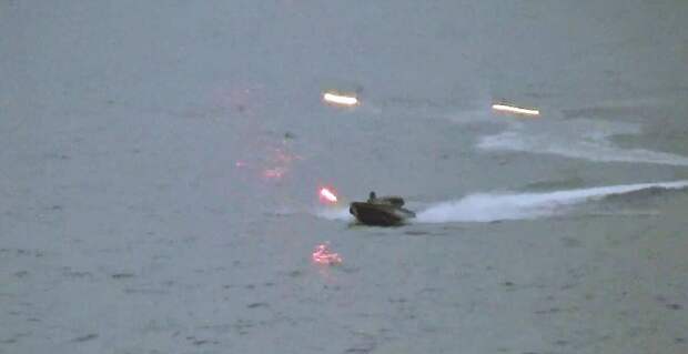 На кадрах беспилотный быстроходный катер приближается к российским кораблям. По нему из штатного вооружения ведётся огонь. В результате противник был поражён.