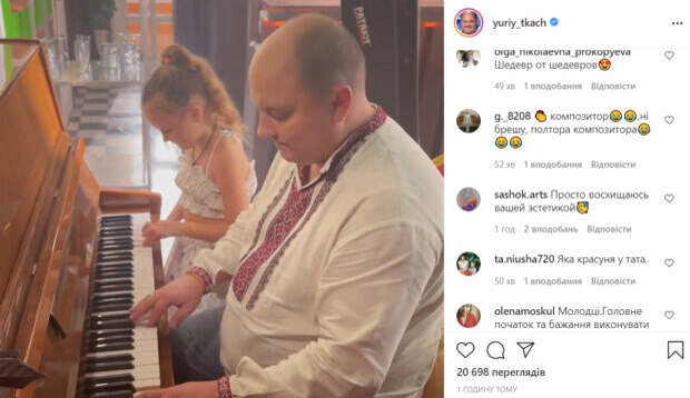 Жена и дочка часто бывают с артистом на съемках и телевизионных проектах. На свежих кадрах Ткач показал, как со своей маленькой дочкой Лиззи в четыре руки играет на пианино. Сам актер позировал для видео в традиционной вышиванке, а дочка была одета в летнюю юбку и топ. «Шедевр в четыре руки)))», - подписал видео артист. В комментариях папе и дочке оставили массу приятных слов. «Лучший папа!», «Лучший актёр! Просто не могу, жду нового сезона!», «Аж сам удивился», «Шедевр от шедевров», «Не знал, что вы играете», «Просто восхищаюсь вашей эстетикой», «Какая красавица у папы», - пишут пользователи сети. Напомним, что Юрий Ткач теперь проводит ночи с Машей Ефросининой: "Не обессудьте". Ранее Politeka писала, что Юрия Ткача с новой прической не узнали в Сети: "Ух ты, какой кучерявый". А еще Politeka сообщала, что Елена Кравец показала Юрия Ткача в неожиданном свете: "Ну прям гейша".