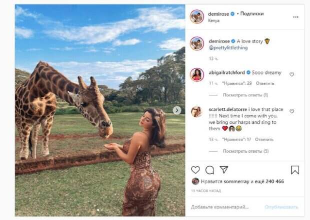 Известная модель Деми Роуз показала себя в необычном образе На фото Деми позирует в длинном легком платье, которое выгодно подчеркнуло все изгибы красотки. Роуз выгнулась, выставляя бюст вперед. Волосы красотка оставила распущенными, а в руках что-то держала. Рядом можно увидеть жирафа, который тянулся к модели.