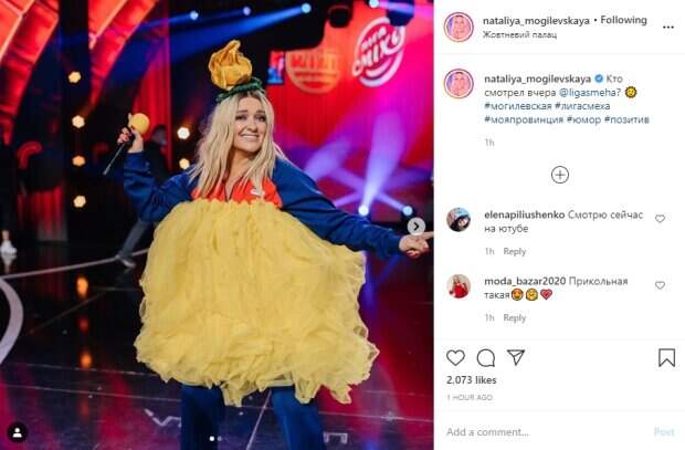 net. Для одного из юмористических номеров знаменитость надела сине-красный спортивный костюм и огромную балетную пачку желтого цвета. Вдобавок, на голову Наталья Могилевская нацепила диадему в виде крупного оранжевого цветка и красные очки. На одном из фото тренер "Лиги Смеха" запечатлена непосредственно во время номера - она вошла в роль и что-то крикнула в микрофон товарищу по команде, показав на него пальцем. На другом снимке Наталья Могилевская с довольной улыбкой позирует на фоне декораций шоу в том же наряде. Пользователи социальной сети оценили необычный образ Натальи Могилевской, некоторые пожалели, что "Моя провинция" вылетела из сезона по итогам последней игры: "Солнечная, Яркая!!!!!!!