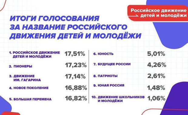 Многие варианты нашли поддержку у большого количества проголосовавших, — отметили в РДДМ. Фаворитом голосования стало нынешнее название организации — Российское движение детей и молодежи. За этот вариант отдали голос 17,51% респондентов. На втором месте название «Пионеры». За это наименование отдали голос 17,23% участников опроса. Еще 17,14% опрошенных хотят, чтобы движение носило имя Юрия Гагарина. Также большое количество участников отдали голоса за названия «Новое поколение» и «Большая перемена». За первый вариант проголосовали 16,88% участников, а за второй — 16,82%. Фото: Минпросвещения России Как добавили, в РДДМ окончательного решения о названии еще нет. Его примут делегаты Первого Съезда 18 декабря. Отметим, что решение о создании общероссийского движения детей и молодежи было принято в июле 2022 года. Участниками движения смогут быть несовершеннолетние, обучающиеся по программам начального общего, основного общего, среднего общего, среднего профессионального и высшего образования. Организацией воспитания и досуга детей будут заниматься взрослые наставники. Движение получит право иметь свою символику — гимн, эмблемы, флаги. Президент России Владимир Путин согласился возглавить набсовет этого движения. Подписывайтесь на telegram-канал и группу «ВКонтакте» «Реального времени».