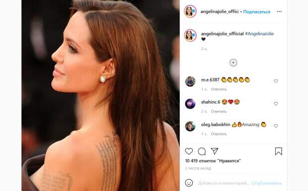 net. На фото Анджелина запечатлена во время одного из своих появлений на красной дорожке. Певица одета в коричневое платье без бретелек и с открытой спиной. Корсет наряда выполнен из плотной ткани и неплотно прилегает к телу актрисы. Открытая спина наряда также позволяет Джоли продемонстрировать свои татуировки на лопатке и предплечье. Конкретное тату изображает текст буддистской молитвы. Известно, что актриса сделала его в Таиланде в качестве оберега от неприятностей. Впрочем, это далеко не единственный рисунок на теле Джоли. Актриса с юности славилась своей любовью к крупным татуировкам. Сейчас они покрывают практически все части тела звезды и каждая из них имеет свое значение. Поклонники Джоли не смогли не прокомментировать ее фото. «Восхитительная», «Красотка», «Я зависим от нее», «Самая красивая женщина», «Супер, очаровательный ангел», - пишут люди. Напомним, Анджелина Джоли в чулках смело расставила ноги ради пикантного фото: "Горячая опасность". Как сообщала Politeka, неукротимая Анджелина Джоли в неприличном мини засветила сладкие места: «Платиновый стандарт». Также Politeka писала, что Анджелина Джоли с дерзостью во взгляде и без лифчика сверкнула пышными размерами: "Обожаю это".
