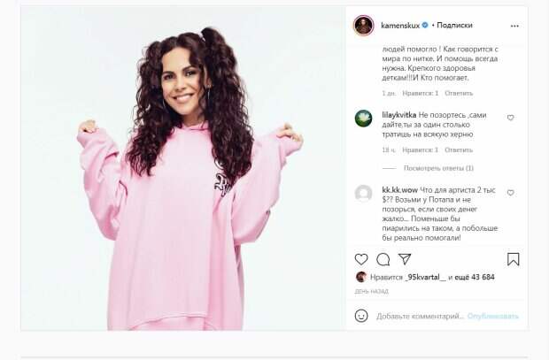 А до этого артистка много раз участвовала в проектах, помогающим бездомным и пожилым людям. В одном из интервью певица рассказала, что ей нравиться участвовать в подобных инициативах, ведь она получила возможность делать добрые дела. В новом посте в Инстаграм Каменских рассказала, что 4 мая празднует 34-летие. По указанному поводу артистка решила обратиться к подписчикам, чтобы те отпраздновали ее день, сделав хорошее дело - помочь собрать деньги для больных детей. "Наша цель - собрать для онкобольных деток 50 000 грн. Верю, мы сможем сделать это и даже больше! А я в свою очередь хочу порадовать благотворителей! И среди тех, кто сделает взнос на сайте, разыграть классные подарочки