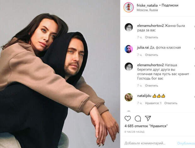 Младшая сестра покойной российской певицы Жанны Фриске, Наталья показала своего нового возлюбленного Как пишет Politeka.net, у себя в Инстаграм красотка опубликовала фото с симпатичным миловидным парнем. Мужчина был одет в толстовку с капюшоном, под которым он спрятал свою голову. Наталья тоже была одета в теплую кофту.