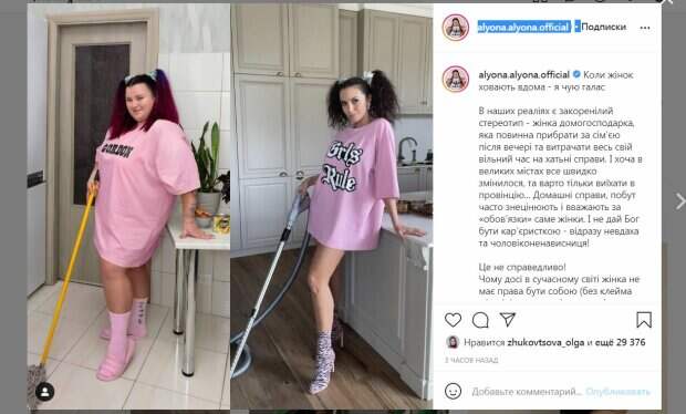 Alyona Alyona позировала в розовой футболке, с двумя хвостиками на голове и шваброй в руках. В посте рэперша поделилась мнением о женщинах-домохозяйках. По мнению артистки, сейчас в украинском обществе существует стереотип, что женщина должна заниматься домашними делами все свое свободное время. "Домашние дела, быт часто обесценивают и считают «обязанностями» именно женщины. И не дай Бог быть карьеристкой - сразу неудачница и мужененавистница! ⠀ Это не справедливо! Почему до сих пор в современном мире женщина не имеет права быть собой (без клейма «феминистка» и т.п.), а должна следовать продиктованным нормам общества?", - написала Алена. За три часа публикация собрала почти 30 тысяч лайков и много комментариев: "Потому что, это удобно. И это воспитывают женщины в сыновьях. Главное действительно быть собой, и человек любящий будет партнером в всем ❤️ П.с. Росла в семье, где женщина - быт и кухня, но сейчас в моей семье готовит муж, я осталась собой))", "Согласна на все сто, поэтому в моей семье, я своих мальчиков всегда приобщаю к домашним делам, а муж меня понимает и помогает. Долго к этому шли