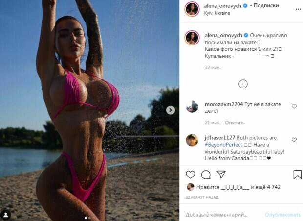 Самые интимные места скрывали лишь крохотные полосочки ткани. Кроме того, верх купальника "подскочил" засветив обнаженную часть прелестей. На звезде были такие же крохотные трусики-бикини_ которые почти ничего не скрывали и дали полюбоваться совершенствами тела. Модель стояла под душем, обливая свои аппетитные части тела со всех сторон, в том числе, со спины, показав упругие ягодицы. "Очень красиво поснимали на закате🌅", - подписала снимок модель. За 20 минут пост собрал более 4000 лайков и много комментариев. "Тут не в закате дело)", "Красивая какая, балдею 😻😻", "Как можно себя не любить, что все искусственное...", "Вау! Вау! Вау! Фото огонь, и Вы просто шикарная😍😍😍", "Злые миражи меня обманывают...", - написали пользователи сети. Напомним, Алена Омович позировала в разных локациях, демонстрируя свои совершенные изгибы. Так, модель предстала в белом топике, который кокетливо приспустила с плеч. Также красотка надела мини-юбку на высокой посадке, которая выделила ее стройную талию. Ранее сообщалось, что Алена Омович показала фигуру в спортивном костюме черного цвета. В тонком черном топе и приспущенных штанах модель выглядела более чем привлекательно. Напомним, украинская Кардашьян запихнула нереальные размеры под тонкую маечку. Как сообщала Politeka, украинская Кардашьян соблазнила пикантным видом в "золотом" бикини. Также Politeka писала, что украинская Кардашьян расстегнула косуху и показала свое пышное "добро"