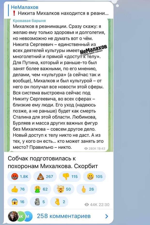 », реагируя на оскорбления от людей. Она отмечает, что писала прямо и желала Михалкову лишь всего самого наилучшего, а касаемо смерти она выразилась так, что надеется на поправку режиссера и что уйдет он намного позже, а не сейчас. Фото: telegram “Кровавая Барыня”Фото: telegram “Кровавая Барыня” Далее телеведущая охарактеризовала отдельных комментаторов ее сообщения о Михалкове: «плохо образован и глуп», «подлый и продал давно последние остатки самоуважения» и так далее. Напомним, что недавно Никиту Михалкова госпитализировали. Попавший в реанимацию режиссер сдал анализы на грипп и COVID-19. Результат тестов знаменитого режиссера отрицательный, данных вирусов у режиссера не обнаружено. Вместе с тем, отмечается, что у Михалкова диагностирована двусторонняя полисегментарная пневмония, которая осложнилась дыхательной недостаточностью. Сообщение Собчак ответила критикам, которые осудили ее за размышления о смерти Михалкова появились сначала на Общественная служба новостей.