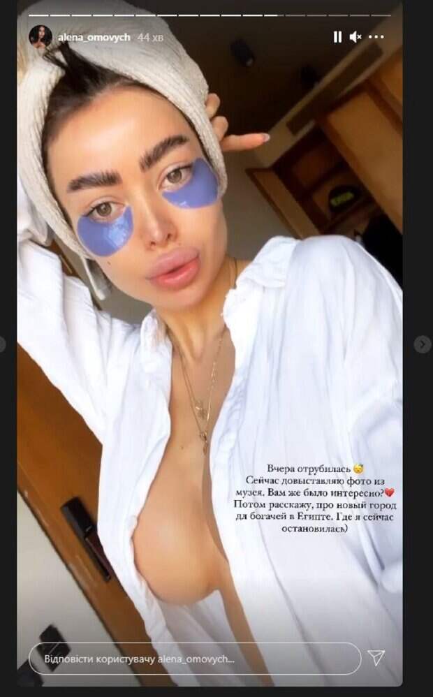 Известная модель Алена Омович, которую называют украинской Кардашьян, показала себя после душа На фото красотка была в рубашке, которую оставила раскрытой, и без белья. Звезда намотала полотенце на мокрые волосы, а под глазами нанесла маску для лица. Видно, что Омович приводит себя в порядок с утра.