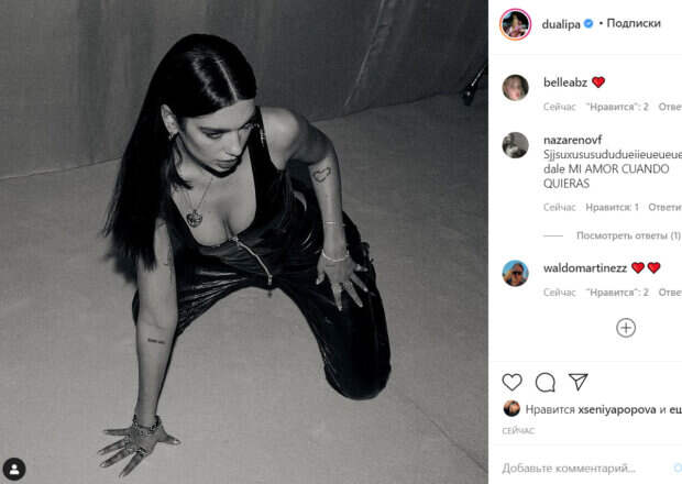 Девушка разместилась на полу, приняв пикантную позу для фотосессии. Однако взгляды поклонников привлекло экстра-декольте звезды, которое выглядело очень горячо. Кулон на шее лишь привлекал внимание к бюсту певицы. Стоит отметить, что на фото можно увидеть многочисленные татуировки артистки, которыми украшены многие участки ее тела. За короткое время фото собрало более 600 тысяч лайков. В комментариях красотке оставили массу приятных слов. «Дуа! Мы тебя не заслуживаем!», «Королева», «Какая кошечка», «Ты выглядишь превосходно, Дуа Липа», «Идеальное фото», «Горячая крошка», - пишут пользователи сети. 25-летняя Дуа Липа стала популярной в Британии, но очень быстро ее песни стали слушать по всей Европе и в США. Сегодня певица невероятно популярна. В ее Инстаграм почти 60 миллионов подписчиков, а ее песни покоряют чарты и хит-парады. Напомним, что взрывная Дуа Липа в кожаном платье с разрезами сразила наповал дерзкой красотой: «Просто космос». Как сообщала Politeka, непредсказуемая Дуа Липа с новой стрижкой и в кружевах поманила к себе томной позой: "Кэти Перри?". Также Politeka писала, что страстная Дуа Липа в платье с неприличными разрезами лишила мужчин спокойствия: "Вау, какой рельеф".