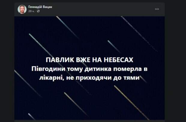 Его легкие были настолько поражены, что начали распадаться. "Павлик уже на небесах. Пол часа назад ребенок умер в больнице, не приходя в сознание", — говорится в сообщении. Стоит отметить, что полиция уже начала следствие по факту ненадлежащего ухода за ребенком. "Расследование было начато после обнародования информации в соцсетях и СМИ о том, что мальчика привезли в реанимационное отделение Могилев-Подольской больницы в крайне тяжелом состоянии, ослабленного, с критически малым весом, как следствие ненадлежащего ухода за ним со стороны матери", - говорится в сообщении. На данный момент проводится судебно-медицинская экспертиза. Если вину мамы Павлика докажут, то ей грозит наказание до пяти лет заключения. Напомним, киевлянка устроила домашние роды по Skype и поплатилась: что известно о состоянии ребенка. Как сообщала Politeka, все могло закончиться трагично: киевлянка родила дома недоношенного ребенка по видеосвязи с «врачом». Также Politeka писала, что жизнь украинки оборвалась во время домашних родов, но ребеночек выжил: что известно о будущем малыша.