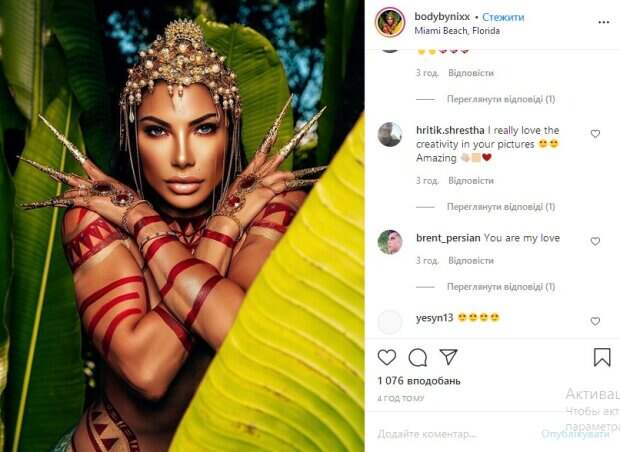 Особой красоты фотографии придали корона и браслеты, которые были на руках у девушки. «Ты настоящая амазонка», «божественная красота», «Николь, ты чистый идеал. Гордись собой», «ты идеальная, малышка», «я действительно тебя очень люблю. В частности, за такие вот снимки», «такая милая и в то же время сильная девочка. Супер», - пишут ее поклонники. До этого сообщалось, что американская фитнес-модель Николь Амато подразнила прелестями в сказочном образе Красотка забралась в заросли джунглей ради сочного кадра. Она перевоплотилась в настоящую русалку. Николь приняла жаркую позу так, чтобы ее разрисованные ноги казались настоящим хвостом, с изумрудно-серебристой чешуей. Кроме того, звезда блеснула ничем неприкрытым бронзовым бюстом, показав всю его "спелость" в самом выгодном ракурсе. Напомним, дерзкая Николь Амато в прозрачном топе показала, чем нокаутирует мужчин Также Politeka писала, что фитнес-модель Николь Амато довела до безумия, показав загорелое тело в крохотном белье А еще Politeka сообщала, что Николь Амато в непристойном купальнике остудила свой пыл, погрузившись в воду
