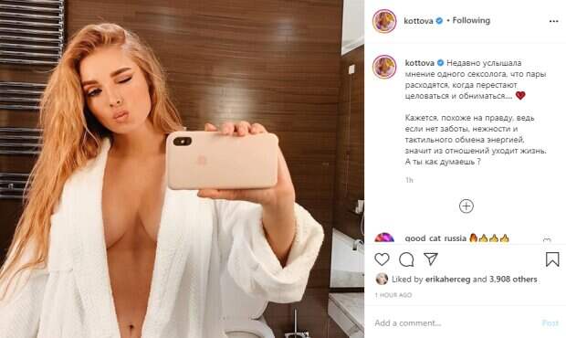 Татьяна не запахнула как следует белый халат, благодаря чему засветила грудь и плоский животик. Она кокетливо подмигнула на камеру и вытянула губы трубочкой. Банный образ дополнила растрепанная прическа. "Недавно услышала мнение одного сексолога, что пары расходятся, когда перестают целоваться и обниматься.... 💔 Кажется, похоже на правду, ведь если нет заботы, нежности и тактильного обмена энергией, значит из отношений уходит жизнь", - такими мыслями Котова поделилась в описании. Пользователи сети выразили свое восхищение в комментариях: "Офигенное фото 😃👍👌"; "Какая же красивая фотография. Вы здесь выглядите просто идеально👌"; "Красотка внеземных масштабов 🌹🌹🌹"; "Ну как можно о чем то думать☺️ такая красота.😍🔥👍❤️"; "Фотография получилась просто шикарная, конечно же в отношениях очень важно всегда быть вместе"; "Я думаю, грудь у тебя офигенная. Это если мягко сказать )". Ранее похожим фото порадовала фанатов певица Вера Брежнева, которая тоже выступала в составе "ВИА Гры". Она сделала селфи у зеркала топлес, прикрыв обнаженную грудь рукой. Волосы артистка собрала в пучок на макушке. Благодаря удачному ракурсу можно заметить, что Вера Брежнева находится в идеальной физической форме и не уступает красотой своей молодой коллеге. Напомним, жаркая блондинка из "ВИА Гры" без белья показала, что прячет под пиджаком. А еще Politeka писала, что роскошная блондинка из "ВИА Гры" Котова показала сочный ракурс без нижнего белья. Также Politeka сообщала, что блондинка из "ВИА Гры" избавилась от трусиков, прикрыв срамоту арбузом.