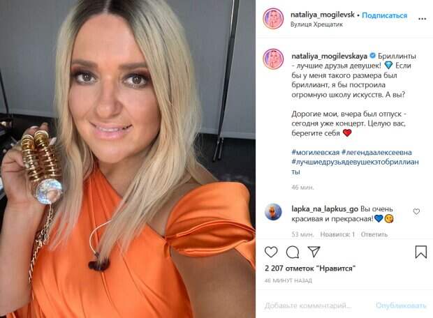 Если бы у меня такого размера был бриллиант, я бы построила огромную школу искусств. А вы? Дорогие мои, вчера был отпуск - сегодня уже концерт. Целую вас, берегите себя», - подписала кадр Могилевская. На фото она позирует в атласном оранжевом платье с приспущенными бретельками. Звезда фотографирует себя с небольшого расстояния, поэтому весь ее наряд рассмотреть не удается. Ярким макияжем Могилевская подчеркнула свои и без того выразительные глаза. Поклонники звезды тут же отреагировали на ее пост. «Вы очень красивая и прекрасная!», «Как жаль, что у вас такого бриллианта нет», «Прелесть», «Лучшие друзья девушек-это хореографы. Вот Дикусар говорит в интервью, что его сердце свободно и что ему нравятся такие женщины, как Джей Ло, умеющие танцевать. О том, что свахе первая чарка, но и первая палка, я в курсе», «А у Вас разве нет бриллиантов?! Странно прямо», «безумно красивая, неповторимая, вы лучшая», - пишут люди. Напомним, довольная Могилевская променяла Яму на сразу двух «лысых», яркие кадры: «Если там Наташа, то…». Как сообщала Politeka, помолодевшая Могилевская раскрыла правду о своем красавчике-«возлюбленном», фото. Также Politeka писала, что счастливая Могилевская залезла в бассейн, вскружив голову роскошным видом: «Глазки светятся».