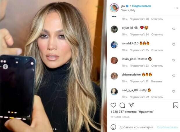 Знаменита 52-летняя актриса и певица Дженнифер Лопес показала, насколько хорошо выглядит без фильтров Недавно артистка приехала в Венецию вместе с Беном Аффлеком, где показала стильный наряд и поприветствовала публику перед множеством камер. Готовясь к очередному светскому вечеру, звезда успела также сделать несколько памятных селфи.