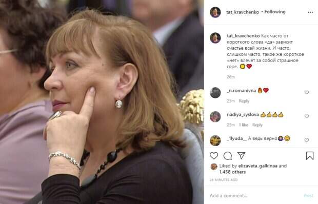 На снимке артистка с сосредоточенным взглядом сидит на стуле в каком-то зале, на заднем плане можно заметить и других людей. Вероятно, Татьяну Кравченко сфотографировали во время концерта или другого светского мероприятия. Можно заметить, что со съемок последнего сезона "Сватов" она заметно постарела, однако сохранила свое обаяние. "Как часто от короткого слова «да» зависит счастье всей жизни. И часто, слишком часто, такое же короткое «нет» влечет за собой страшное горе. ☀️❤️", - подчеркивается в описании. Пользователи соцсети высказались о внешнем виде и филосовских взглядах из описания: "А ведь верно