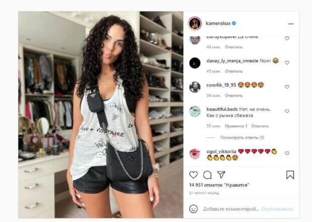 На фото Настя была в шортиках и майке, а образ дополнила стильной сумочкой. Красотка стояла в гардеробной и на фоне можно увидеть множество обуви. "Взгляд дня. Нравится?", - написала Настя. Фанаты поставили тысячи лайков и написали комментарии: "Бомбезно", "Сумка огонь", "Как раз слушаю НК", "Ответьте по поводу отмены концерта в Харькове 25 июня ?", "Настя, Вы эталон женственности и красоты! Спасибо Вам, что радуете нас своим творчеством!!!", "Нет, не очень. Как с рынка сбежала", "Понравилась очень". Сообщалось, что ведущая Катя Осадчая заинтриговала любопытными кадрами. Катя опубликовала свежие фото с мероприятия в своем микроблоге в Инстаграм. На кадрах ведущая предстала в широком длинном платье красного оттенка, напоминающем цветок. Ткань свободно легла, скрывая в своих складках беременный животик звезды. Напомним, Каменских в мини-шортиках досталось за внешний вид на прогулке с подругой А еще Politeka писала, что Каменских блеснула похудевшей фигурой в узких велосипедках Также Politeka сообщала, что Каменских распахнула платье, показав "самый сок" в новом бикини