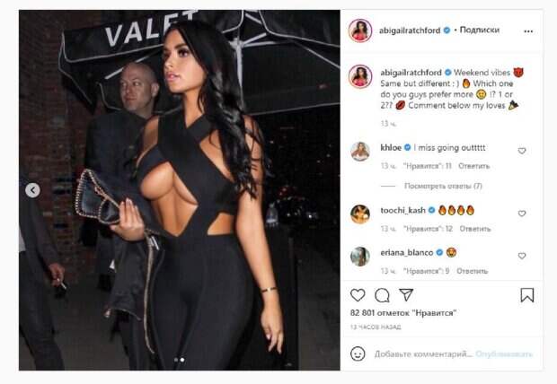 Об этом пишет Politeka.net со ссылкой на страничку знаменитости. "Атмосфера выходного дня. То же, но другое; ) Какой из них вы, ребята, предпочитаете больше!? 1 или 2 ?? Комментарий под моими любимыми", - написала модель под фото. На втором снимке звезда уже показалась в комбинезоне, который состоял из узких штанин и полосочек ткани, которые сжимали пышный бюст красотки. Эби совсем не смущало, что он сильно выпирал из такого эпатажного наряда, дополнив образ стильной сумочкой. Фанаты поставили более 80 тысяч лайков и написали комментарии: "Я скучаю по выходу", "Любите их всех", "Вау, ты сумасшедшая", "Оба выглядят красиво", "Прекрасная Эбигейл", "Оглушающая", "Какая красавица Эбигейл!", "Такой потрясающий наряд и вы !!!!", "Это был мой первый раз, когда я загорал", "Мне больше всего нравится номер 1, Эбигейл", "Оба горячие, но 2 мой любимый". Напомним, фигуристая Эби Рэтчфорд в образе соблазнительной морячки поманила своими "буйками" А еще Politeka сообщала, что Эби Рэтчфорд в соблазнительных чулочках пригласила поиграть, задрав ножку Также Politeka сообщала, что горячая Эби Рэтчфорд вывалила огромный бюст, поиграв в ненасытную хищницу