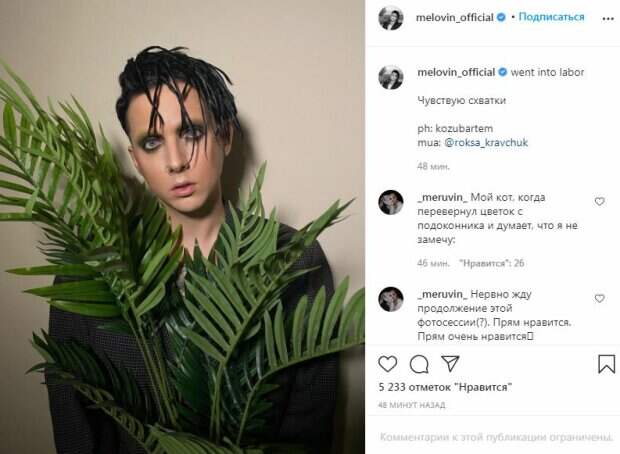 Больше всего привлекали внимания глаза звезды, ведь он подчеркнул их черными тенями и карандашом. Брови артиста были практически бесцветными. Сережка в носу дополнила образ. "Чувствую схватки", - подписал певец. За 40 минут пост собрал более 5000 лайков и много комментариев. "Мой кот, когда перевернул цветок с подоконника и думает, что я не замечу:", "Нервно жду продолжение этой фотосессии(?). Прям нравится. Прям очень нравится