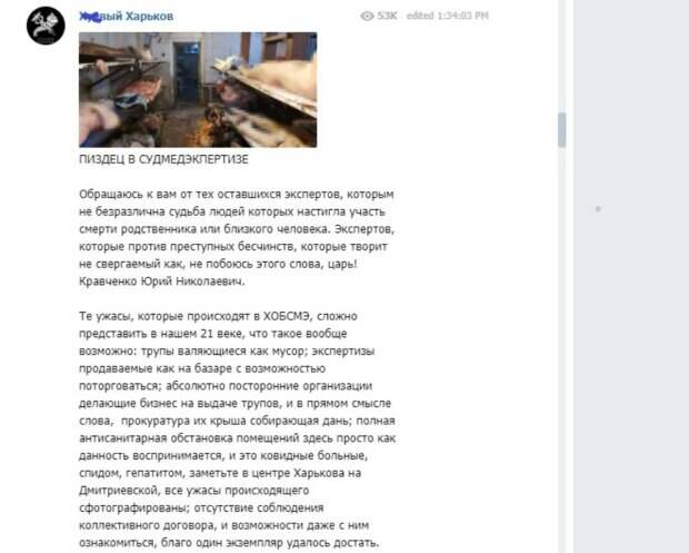 В сети появились ужасающие кадры с харьковского морга Как передает Politeka.net, вопиющие фото опубликовали на Telegam-канале "Х**вый Харьков". Ужасы происходящего в местном морге удалось запечатлеть на камеру. "Трупы валяющиеся как мусор; экспертизы продаваемые как на базаре с возможностью поторговаться; абсолютно посторонние организации делающие бизнес на выдаче трупов, и в прямом смысле слова, прокуратура их крыша собирающая дань; полная антисанитарная обстановка помещений здесь просто как данность воспринимается, и это ковидные больные, спидом, гепатитом, заметьте в центре Харькова на Дмитриевской", - сообщил аноним, который является работником морга.