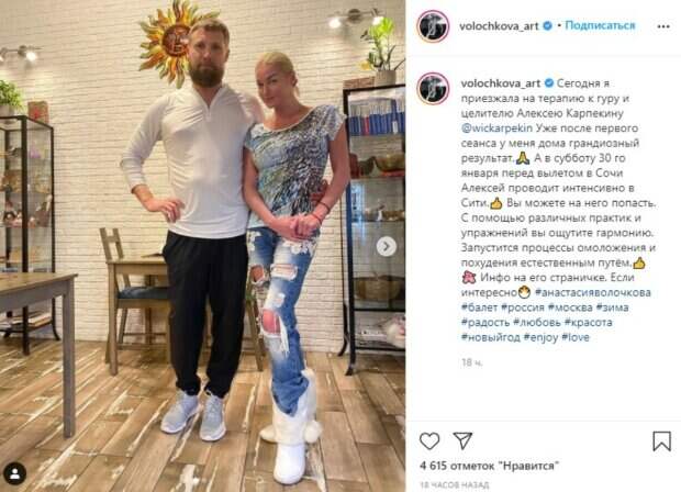 В этот раз балерина похвасталась посещением салона, где работает популярный гуру целитель. Причем не обошлось без пикантных фото. Анастасия не только показала совместное фото с мужчиной в салоне, но еще и позировала на специальной кушетке без одежды и лифчика, прикрывшись одной простыней. «Сегодня я приезжала на терапию к гуру и целителю Алексею Карпекину. Уже после первого сеанса у меня дома грандиозный результат.