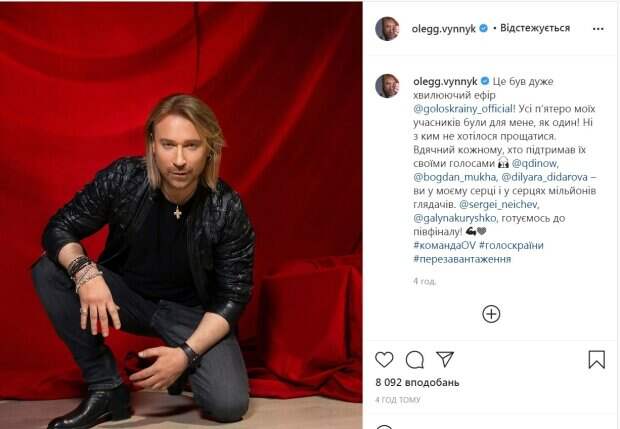 Тренер шоу "Голос країни" Олег Винник заинтриговал интересным фото Как пишет Politeka.net новый кадр артист опубликовал на своей странице в Инстаграм заставил пользователей сети думать, что Винник на что-то намекает. «Это был очень волнующий эфир @goloskrainy_official! Все пятеро моих участников были для меня, как один!