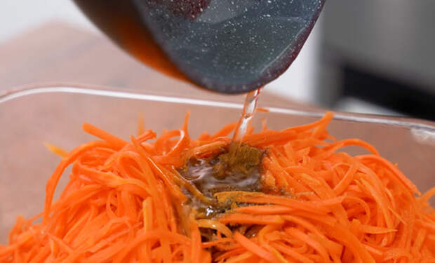 Морковь обычно лежит на дальней полке холодильника и очень зря – ведь из нее можно сделать шикарную закуску за считанные минуты. Морковь очень хорошо маринуется и прекрасно впитывает все новые вкусы. Это ее свойство позволяет делать массу вкуснейших закусок. Натираем морковь на терке и посыпаем солью и сахаром.