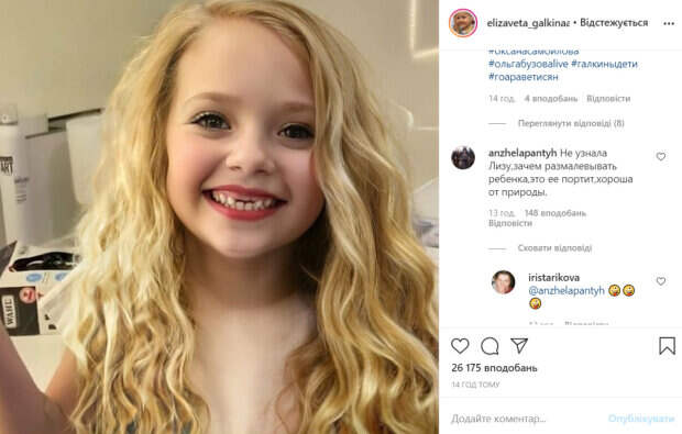 Волосы девочки были накручены. «Красавица, вся в маму», - подписали фото авторы аккаунта. Однако поклонники не согласились с мнением автора. В комментариях подняли шум по поводу макияжа на лице у маленькой девочки. «Не узнала Лизу, зачем размалевывать ребенка, это ее портит, хороша от природы», «Всему свое время. Для косметики это время тоже придет», «Прекрасная девочка. Бог одарил ее красотой и талантами... не забирайте у неё детство, делая из неё «деваху», она милая чистая без макияжа», «Не надо портить естественную красоту косметикой, Лизочка и без косметики, красавица», «Лиза очень красивая девочка, но без этого ужасного раскраса, извините, конечно», - пишут пользователи сети. Стоит отметить, что, несмотря на возраст, Лиза очень популярна в сети. Ее обожают тысячи поклонников ее мамы и папы. Вместе с братом Гарри они растут очень разносторонними детьми. Напомним, что Лиза Галкина решила сменить прическу Пугачевой и довела брата: "Не надо, мама и так...". Как сообщала Politeka, Галкин спрятался от Пугачевой и детей, ошарашив признанием: "Давно уже собирался...". Также Politeka писала, что дочь Пугачевой и Галкина вынесла "модный приговор" старшей сестре Кристине Орбакайте: "Растет настоящая. ..".