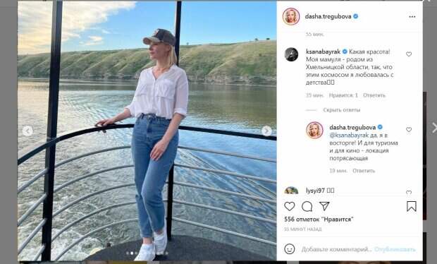 "Наш #кинотур по Хмельницкой области. За два дня увидели замечательно сохранившиеся исторические локации (дворец Орловских в Малиевцах, усадьбу Чечеля в Самчиках, Меджибожскую крепость, мистическую Бакоту), всеми любимый Каменец-Подольский, уютный Хмельницкий (центральная пешеходная улица которого очень похожа на Дерибасовскую), и, конечно же, невероятной красоты природу - водопады, озера, леса, скалы и роскошный Днестр. Кинокомиссия Хмельницкого готовит каталог локаций и готовится принимать киногруппы. А Хмельницкий готовится к кинофестивалю в сентябре!", - написала артистка. Почти за час публикация собрала сотни лайков и немного комментариев. "Какая красота! Моя мамуля - родом из Хмельницкой области, так, что этим космосом я любовалась с детства