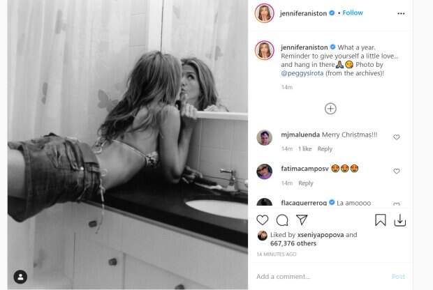 В такой неудобной позе Дженнифер Энистон с завороженным взглядом поцеловала свое отражение в зеркале. "Что за год. Напоминание о том, чтобы подарить себе немного любви... и держись там