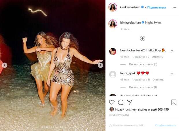 На снимках можно увидеть Кардашьян в компании ее сестры Кортни и подружек. При этом Ким была одета в золотистое платье с короткой юбкой и глубоким декольте, а Кортни предстала в полупрозрачном и еще более коротком наряде из серебряных пайеток. На фото красотки вовсю резвятся в воде недалеко от берега, а затем выходят на сушу с мокрыми волосами и нарядами. «Ночное плавание», - лаконично подписала кадры своих развлечений Ким. Менее чем за полчаса ее пост набрал более 600 тысяч лайков и огромное множество комментариев. Стоит отметить, что в сети активно обсуждают дорогой праздник, который устроила Ким. Многие жестко осуждают звезду за массовые гуляния на частном острове в разгар пандемии. До этого мы писали, что Ким отдыхает со своими родственницами в теплых краях, откуда порадовала поклонников фото в купальнике. Звезда предстала в микро-бикини, выставив на всеобщее обозрение формы, благодаря которым прославилась на весь мир. Крохотный купальник коричневого оттенка состоял из треугольных лоскутков ткани, держащихся на тончайших лямках. Напомним, влажная Кортни Кардашьян похвасталась утехами с завидными красавчиками на частном острове: "Лучшее трио". Как сообщала Politeka, 40-летняя Ким Кардашьян в золотом декольте показала, как отрывалась на частном острове. Также Politeka писала, что Ким Кардашьян с сестричками показали идеальные формы в микро-бикини: "Девочки просто...".