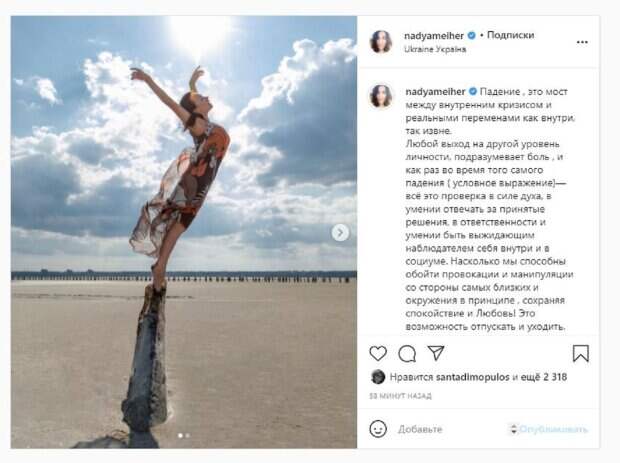 "Падение , это мост между внутренним кризисом и реальными переменами как внутри, так извне. Любой выход на другой уровень личности, подразумевает боль , и как раз во время того самого падения ( условное выражение)— всё это проверка в силе духа, в умении отвечать за принятые решения, в ответственности и умении быть выжидающим наблюдателем себя внутри и в социуме. Насколько мы способны обойти провокации и манипуляции со стороны самых близких и окружения в принципе , сохраняя спокойствие и Любовь! Это возможность отпускать и уходить, не откладывая на завтра. Но на падение необходимо отважится . Или тебя столкнут уже накопившиеся обстоятельства . Выбирать нам! Но во втором варианте развития сценария, будет намного больнее и болезней переносится эти самые перемены . Конечно, в идеале осознаное решение. Хотя сами по себе перемены, это уже большая возможность к познанию себя и других. В добрый ПУТЬ всех , кто уже так близок, и кто на завершающем этапе", - написала Надя. Фанаты поставили более 2 тысяч лайков и написали комментарии: "Как же красиво", "Фото супер", "Все ещё Куяльник. Фотки супер..", "Удивляюсь, какие грамотные философские посты! Спасибо большое!", "Прекрасная Надежда и прекрасные слова! !!", "Но ведь как красиво падает..." Напомним, экс-ВИА Гра Мейхер в кожаном топе сверкнула аппетитными формами А еще Politeka сообщала, что Санта Димопулос сообщила о тревожных симптомах, нужна помощь врача Также Politeka писала, что экс-ВИА Гра Надя Мейхер в приталенном платье впечатлила своим талантом