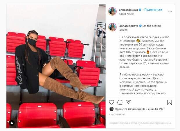 Известная певица Анна Седокова показала себя и рассказала о баскетболе На кадрах звезда позировала в больших сапогах и пиджаке. Как можно заметить, Анна решила не надевать штаны, зато про маску не забыла. Девушка расположилась удобно на сиденьях баскетбольной арены. Волосы у Седоковой были собраны в косички.
