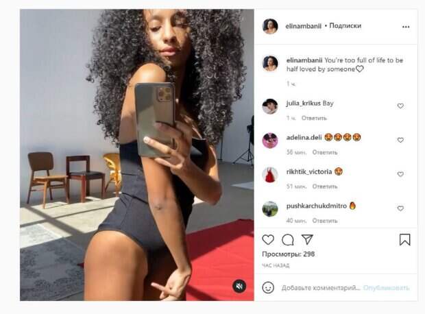 И хоть у красотки не так много подписчиков в Инстаграм, Мбани там регулярно делиться своими фото и видео. В этот раз Элина опубликовала ролик, где сидела на коленках в боди. Красотка подвигалась перед камерой, демонстрируя идеальную фигуру и ягодицы. "Ты слишком полна жизни, чтобы тебя кто-то наполовину любил", - написала Элина под видео. Фанаты посмотрели ролик почти 300 раз и написали комментарии: "Вау", "Огонь", "Огненная крошка". Мы писали, что звезда студии «Квартал 95» Элина Мбани показала стройные ножки в женственном образе. На снимках Элина предстала в легком весеннем образе. Так, на ней белая блуза из слегка просвечивающейся ткани в черный горошек, а также легкая пышная юбка. Кудрявые волосы темнокожей красотки придают ее образу еще больше игривости и взбалмошности. Напомним, экзотическая звезда "Женского квартала" в "наряде Евы" восхитила неземной красотой А еще Politeka писала, что экзотическая красотка из "Женского квартала" показала всю свою нежность в прозрачном наряде Также Politeka сообщала, что экзотическая красотка из "Женского квартала" предалась страсти на полу