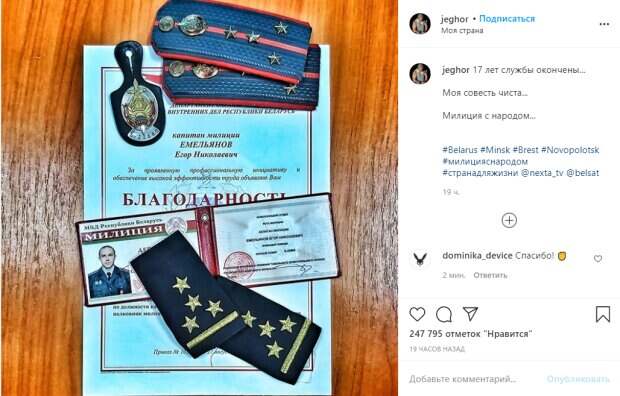 На фоне протестов в Беларуси капитан милиции уволился с МВД Как передает Politeka.net, соответственный пост Егор Емельянов опубликовал на своей страничке в Instagram. Такое решение он принял после 17 лет службы в органах. "17 лет службы окончены...Моя совесть чиста...Милиция с народом...", - сообщил он в подписи к посту.