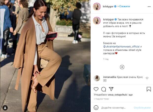 В момент съемки Кристина изящно поправляет застежку босоножек и мило улыбается про себя. В подписи к кадру Горняк написала: "Так всем понравился этот образ вчера, что я решила добавить его в пост! Я «за» фотографии в которых есть жизнь! За эмоции! Бежала на @ukrainianfashionweek_official и попала в объективы street style хантеров!". Одним из первых снимок любимой жены прокомментировал Остапчук, он написал: "Моя самая шикарная". А другие пользователи в комментариях тоже начали осыпать девушку комплиментами. Напомним, Жена ведущего "Співають всі" Остапчука рассказала о проблемах со здоровьем и обратилась за помощью: "Кто знает...". Как сообщала Politeka, Ведущий "Співають всі" Остапчук похвастался новым "членом" семьи: "А у нас пополнение". Также Politeka писала, что Ведущий "Співають всі" Остапчук после скандального выступления Меладзе на шоу уехал к теще: "Ой...".