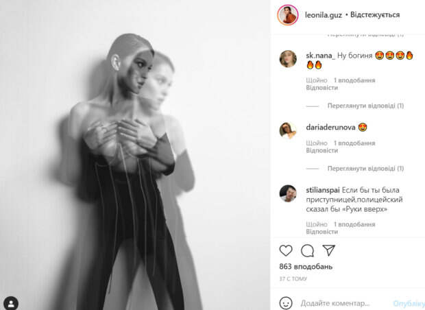Соблазнительные изгибы девушки, ее тонкие плечи и ключицы привлекли взгляды поклонников. Стоит отметить, что такое фото перед сном раззадорило фанов модели. В комментариях красотке оставили массу приятных слов. «Опасная», «Вы восхитительно красивы!», «Если бы ты была преступницей, полицейский сказал бы «Руки вверх», «Ну богиня», «Это просто огонь», - пишут пользователи сети. Леониле Гузь всего 21 год, но уже сейчас девушка строит успешную карьеру в модельном бизнесе. Девушка родом из Херсонской области. На конкурсе красоты она завоевала второе место, но из-за дисквалификации победительницы конкурса титул был передан ей. Ранее мы писали, что Гузь похвасталась роскошными длинными волосами. Сама девушка работала парикмахером, поэтому прекрасно знает, как поддерживать волосы в прекрасном состоянии. При помощи помады телесного цвета модель подчеркнула свои пышные губы, а образ дополнила скромным макияжем. Напомним, что Леонила Гузь свела с ума вызывающим видом после преображения: "Божественный ангел". Ранее Politeka информировала, что Леонила Гузь блеснула ягодицами в странном наряде: "Девушка красивая, но...". Также портал Politeka писал, что Леонила Гузь засветила идеальные формы в лифчике: "Вот, кто не ел. ..".