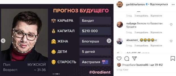 Российский комик Гарик Харламов вслед за своей бывшей женой насмешил фанатов предсказаниями Как передает Politeka.net, у себя в Инстаграм артист опубликовал фото из приложения, которое предсказывает будущее. Ранее такой же скрин опубликовала у себя Асмус. Ей программа предсказала мужа-философа и троих детей.