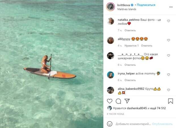 Поклонницы наперебой заваливают молодую блогершу вопросами, на которые она с радостью отвечает. Примечательно, что девушка сама заявила – за все время она набрала всего три килограмма, но талия с 59 см ушла в 69. На новом фото Даша позировала в ярком купальнике посреди океана. Сидя на доске для серфинга с веслом, девушке удалось подчеркнуть и загорелое тело и округлившийся живот в целом. «Берём максимум от последнего дня на Мальдивах☺️ Завтра домой, даже не верится, что засыпать мы будем уже в обнимку с нашим котом