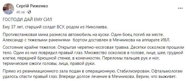 Один боец погиб на месте. Александр с тяжелыми ранениями бортом доставлен в Мечникова на аппарате ИВЛ", - сообщил главный врач. Рыженко также отметил, что сейчас состояние бойца оценивается как крайне тяжелое. У него открытая черепно-мозговая травма, а десятки осколков прошили тело. Один из осколков повредил правый глаз. Также есть множество осколков в голове, лице, шее, грудной клетке, передней брюшной стенке, в конечностях. Диагностированы переломы пальцев рук и ног, термические ожоги головы, лица и правой руки. "Прямо из реанимационного зала подан в операционную. Стабилизирован. Офтальмологам удалось спасти правый глаз. Впереди долгое лечение у Мечникова. Верим, что выживет", - написал Рыженко. Как известно, с начала военной агрессии России на Донбассе в больнице им. Мечникова активно спасают жизни украинских военных. За годы войны врачи медицинского учреждения спасли более 3 тысяч бойцов ВСУ. Напомним, жизнь украинского бойца оборвалась в один миг, фото: "без отца остались дочь и сын". Как сообщала Politeka, боец ВСУ едва не лишился конечностей, но снова рвется на передовую: "я ни секунды не жалел". Также Politeka писала, что боец ВСУ трагически ушел из жизни, украинцы не верят до последнего.