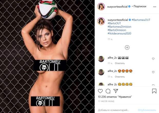 На кадре модель предстала полностью без одежды, прикрывшись лишь черными прямоугольниками с призывом к президенту футбольного клуба "Барселона" уйти с поста президента. Поклонники Сьюзи поразились ее смелостью не только во взглядах, но и во внешнем виде. "Такой хочется забить гол", "Шутки в сторону", "Вау, цензура", - писали под мостом модели. Отметим, что титул «Мисс бум-бум» ей достался уже во второй раз: ранее ее ягодицы признавались лучшими в 2015 году. Известно, что по условиям конкурса, женщинам нельзя пользоваться услугами пластических хирургов для изменения размеров или вида ягодиц. Так что Кортес обязана своими шикарными формами лишь матушке природе. Напомним, хозяйка самых красивых ягодиц дерзко выгнулась, восхитив размером "персиков" А еще Politeka писала, что хозяйка самых красивых ягодиц соблазнила в видом латексе и прозрачном белье Также Politeka сообщала, что хозяйка самых красивых ягодиц блеснула упругой гордостью в микро-бикини
