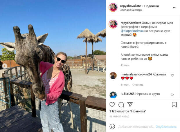 В поездке Репяхова не теряет времени даром. Так, сегодня она побывала в зоопарке, где познакомилась с местными обитателями. На новом фото девушка позирует с одним из них. Репяхова решила пофотографироваться с высоким жирафом по кличке Вася. О нем она и рассказала в своем посте. «Хоть и не первая моя фотография с жирафом, но все равно куча эмоций. Сегодня я фотографировалась с папой Васей. А вообще там живет семья мама, папа и ребёнок их», - рассказала девушка. На фото она действительно выглядит крайне счастливой. Подписчики Репяховой отреагировали на ее пост. «Красивая», «Нереально круто», «Очень красиво и самой бы хотелось там побывать», «Огонь», - пишут люди. Напомним, молодая жена Виктора Павлика показала, куда уехала с трехмесячным сыном без мужа. Как сообщала Politeka, молодая жена Виктора Павлика похвасталась достижениями трехмесячного сына. Также Politeka писала, что молодая жена Павлика в расстегнутом пиджаке поделилась планами на ближайшее время.