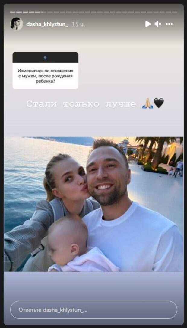 В частности, у звезды поинтересовались, какими стали отношения пары после рождения ребенка. "Стали только лучше", - призналась Хлистун, а ответ она подкрепила фото с мужем и ребенком. Однако сейчас Макса Михайлюка нет рядом с женой и ребенком. Как оказалось, он работает. Также модель откровенно рассказала, что за время беременности она поправилась на 25 кг. Но нельзя не отметить, что девушка быстро пришла в прежнюю форму. Красотка раскрыла секрет таких изменений: "Спорт, питание, массажи, восстановление гормонального фона". "Я всегда была в идеальной форме для работы, и при этом не сидела на диетах. Но точно также у меня есть сила воля не есть фигню. Поэтому, если бы потребовалось сбросить лишний вес, я бы просто закрыла рот, но никак не прибегала к булимии", - написала модель. Отметим, Макс Михайлюк и Даша Хлистун познакомились в интернете. Мужчина написал модели в Инстаграм. Напомним, жена "Холостяка" Михайлюка призналась, что случилось с ее лучшими подругами Как сообщала Politeka, экс-Холостяк Михайлюк показал, как быстро растет его с Хлистун дочка Также Politeka писала, что жена "Холостяка" Михайлюка с малышкой на руках поделилась откровением