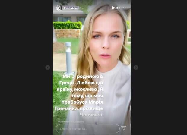 Как оказалось, у звезды есть греческие корни: ее прабабушка по маминой линии не была украинкой. «Привет из Греции! Обожаю эту страну! Мы с семьей на отдыхе. Мне здесь очень хорошо. Возможно потому, что моя прабабушка Мария по маминой линии из Греции, ее фамилия Чапчакчи. Поэтому у меня есть греческие корни», - рассказала Фреймут в своем новом видео. Она также показала себя в белой рубашке на фоне зелени и несколько кадров с морем. Ранее мы писали, что Фреймут поздравила с днем рождения ведущего Дмитрия Комарова. Она поделилась яркими совместными фото, на которых она запечатлена в компании Комарова. На снимке ведущие лежат рядом в шезлонгах и держатся за руки. При этом Фремйут одета крайне необычно: на ней блуза с вышивкой, юбка, меховые «тапочки», варежки и шапка-ушанка. Напомним, 39-летняя Фреймут сравнила себя с юной нимфой, выдав порцию нравоучений: "Аж коробить начинает...". Как сообщала Politeka, Фреймут засветилась за ручку с женатым Комаровым из «Мир наизнанку»: «У нас с тобой столько...». Также Politeka писала, что Фреймут после нового эксперимента с внешностью резко "состарилась": "На себя не похожа".