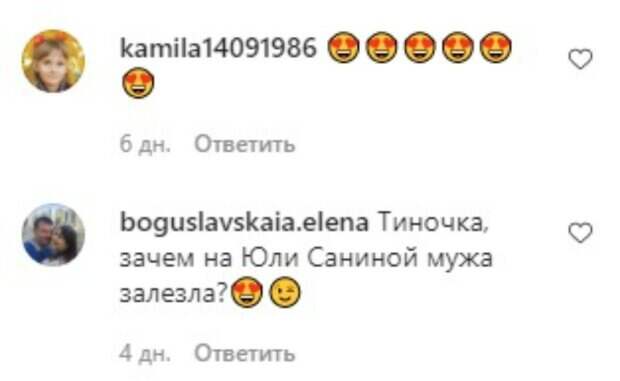 Напевая вою песню, Тина залезла на шею мужчине, которого в сети прозвали копией супруга Юлии Саниной. При этом артистка не прекратила исполнять композицию и всячески двигалась в такт музыке, пока сам мужчина вынужден был просто стоять. Столь пикантное выступление вызвало бурю обсуждений в сети. «Новое видео в TikTok от королевы скандала! Новая Тина Кароль, новая музыка, новый Скандал!», - сказано в сообщении. Пользователи сети сразу отметили схожесть мужчины с супругом певицы Юлией Саниной. С певицей Кароль состоит в хороших дружеских отношениях, что лишь подогрело сплетни: «Тиночка, вы уже не отличаетесь от общей массы...; А мужику повезло