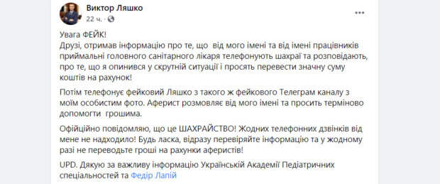 Виктор Ляшко во время локдауна предупредил украинцев о мошенничестве Главный санитарный врач Украины Виктор Ляшко оказался в центре внимания злоумышленников, которые начали от его имени просить деньги. Он призвал украинцев быть внимательнее и не верить фейкам. Об этом он рассказал на своей странице в Facebook.