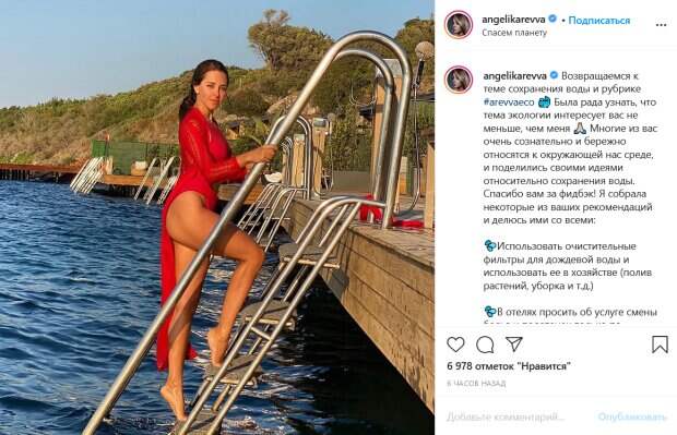 Красотка отправилась купаться в ярко-красном купальнике и кружевной пляжной накидке ему в тон. Для фото Ревва выбрала удачную позу и ракурс, которые позволили ей во всей красе показать подтянутые ягодицы и стройные ножки. В подписи к фото Анжелика подняла важную тему сохранения воды и поделилась соответствующими рекомендациями. Поклонники красотки активно комментируют ее пост в соцсети. «Нереальная», «А я думала откуда у Вас столько красоты теперь поняла, что всё из-за Вашей шикарной и светлой души», «Какая красавица. Повезло Александру», «Анжелика вы как всегда прекрасны», «Ах, какая женщина люблю вас», «Обворожительная фея», - пишут люди. Ранее мы писали, что Анжелика Ревва также поблагодарила всех за поздравления с днем рождения в своем Инстаграм. Она поделилась своим детским черно-белым фото и рассказала, что после празднования проснулась самым счастливым человеком. «Муж мой вчера, такое натворил... устроил мне день Рождения мечты.. я не могу вам рассказать.. получу, но хочеееется все вывалить, еле держусь», - добавила она. Напомним, Артур Пирожков внезапно признался в любви посиневшему другу. Как сообщала Politeka, солнечная дочь Артура Пирожкова показала, как отжигает с папой, кадры веселья. Также Politeka писала, что жена Артура Пирожкова показала, какой была раньше и заставила себе завидовать: "Муж такое натворил...".