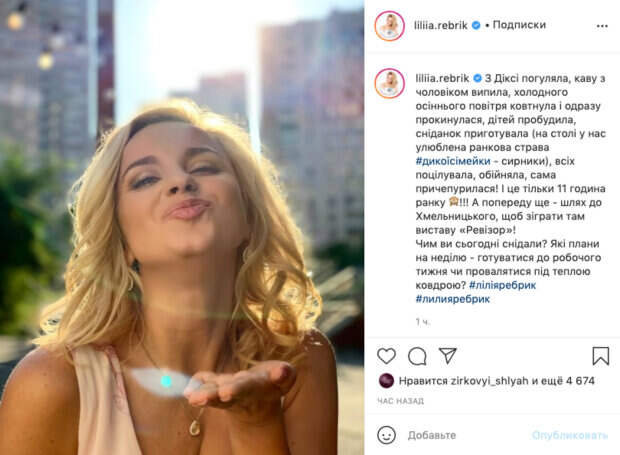 На этот раз Лилия Ребрик опубликовала новое фото. На снимке телеведущая посылает воздушный поцелуй в камеру. Под фото она рассказывает, как прошло её утро и о том, что её ждет в выходной день. "С Дикси погуляла, кофе с мужем выпила, холодного осеннего воздуха глотнула и сразу проснулась, детей пробудила, завтрак приготовила (на столе у нас любимая утренняя блюдо # дикоисимейкы - сырники), всех поцеловала, обняла, сама нарядилась! И это только 11:00 утра