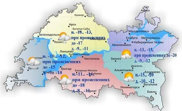 В субботу, 29 января, в Татарстане прогнозируется облачная погода. Местами небольшой снег. Ветер юго-восточный умеренный, сообщается на сайте Гидрометцентра РТ. Максимальная температура воздуха днем составит -7... -12 градусов. В Казани ожидается от -9 до -11 градусов. В Набережных Челнах синоптики прогнозируют от -9 до -12 градусов.